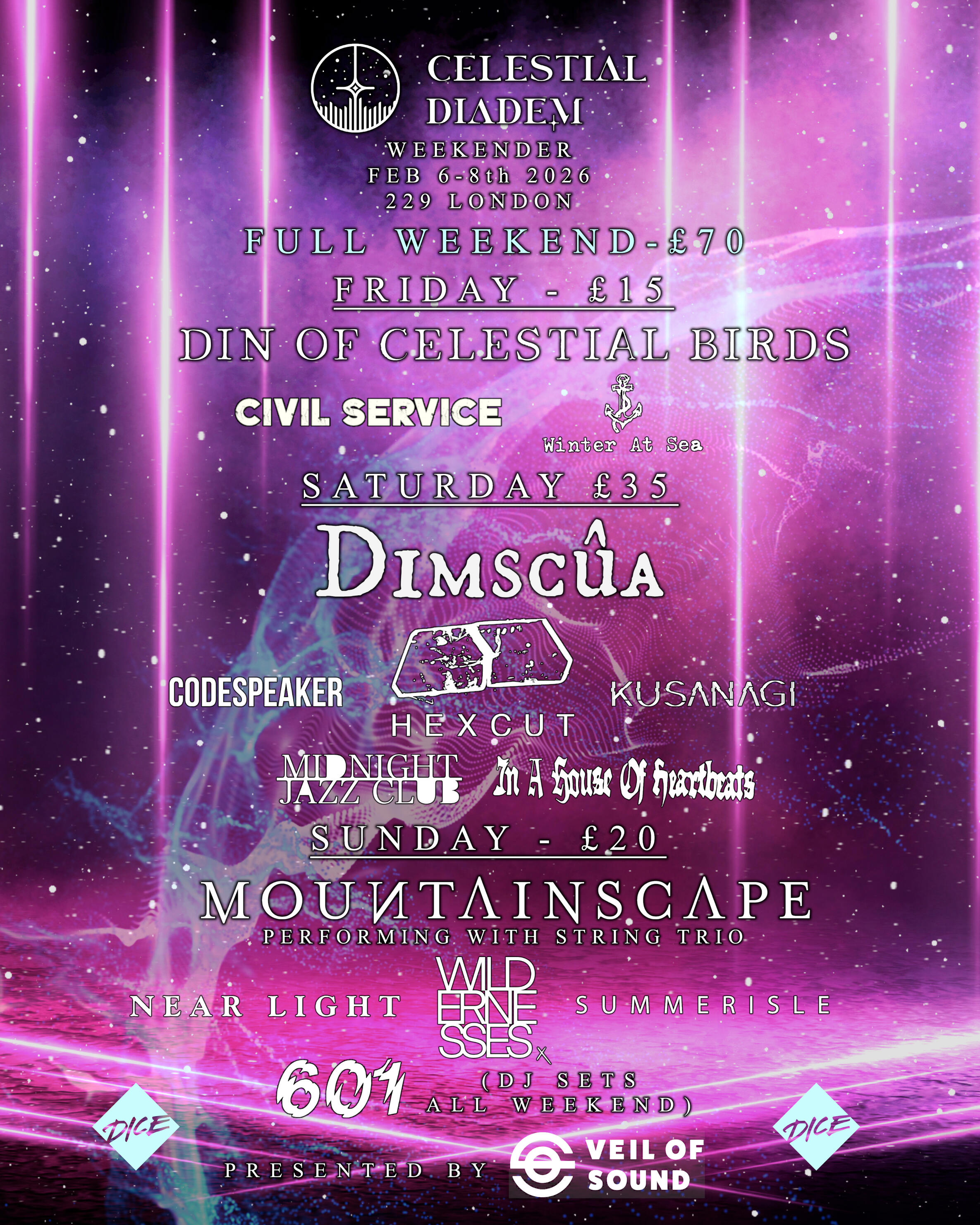 | February 6-8 | 229 | London | CELESTIAL DIADEM WEEKENDER with Din of Celestial Birds, Winter at Sea, Dimscua, Hexcut, Codespeaker, Kusanagi, Midnight Jazz Club, In a House of Heartbeats, Mountainscape, Wildernesses, Near Light & Summerisle |