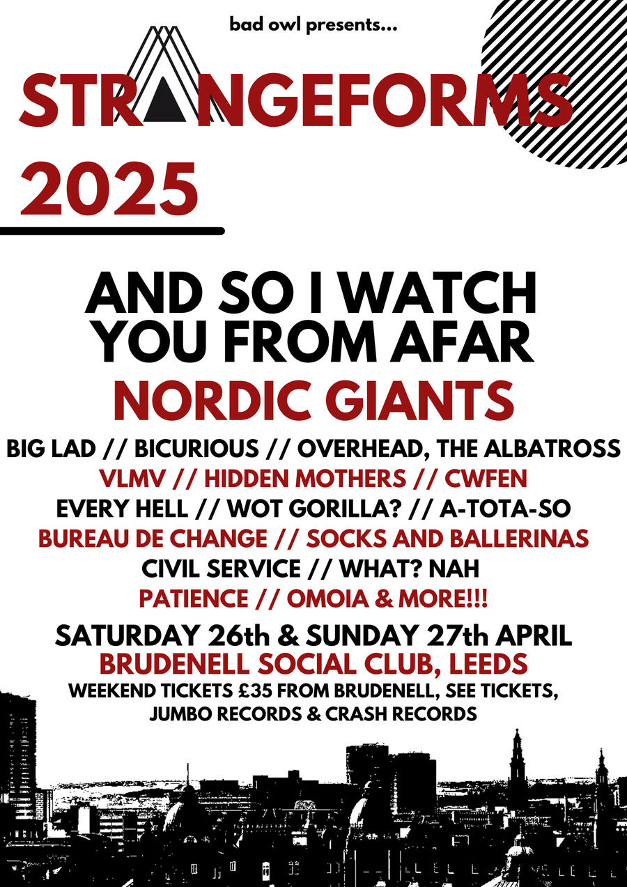 | April 26/27th | Brudenell Social Club | Leeds | StrangeForms 2025 - And So I Watch You From Afar, Nordic Giants, Svalbard, Overhead the Albatross, Cwfen, VLMV, Bicurious, Hidden Mothers, Every Hell, Big Lad, Bureau de Change, Wot Gorilla?, What? Nah, Socks & Ballerinas, Patience, Omoia & more. |